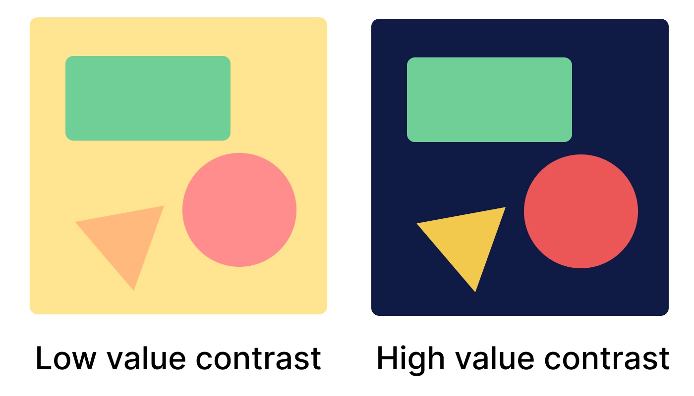 - Low value contrast (elements are closer in lightness/darkness) can create a softer, calmer, or more subtle mood.