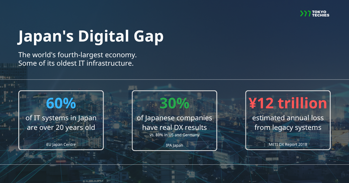 - Only 30% of Japanese companies have made real progress on digital transformation, compared to 80% in the US and Germany (IPA Japan)